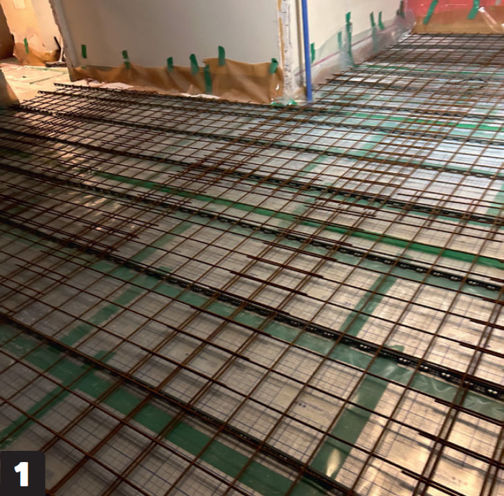 Aluksi koko lattialle asennetaan raudoitusverkot. Ne tuetaan eristeiden yläpuolelle muovikorokkeilla, jotta verkot jäävät betonilaatan puoliväliin.