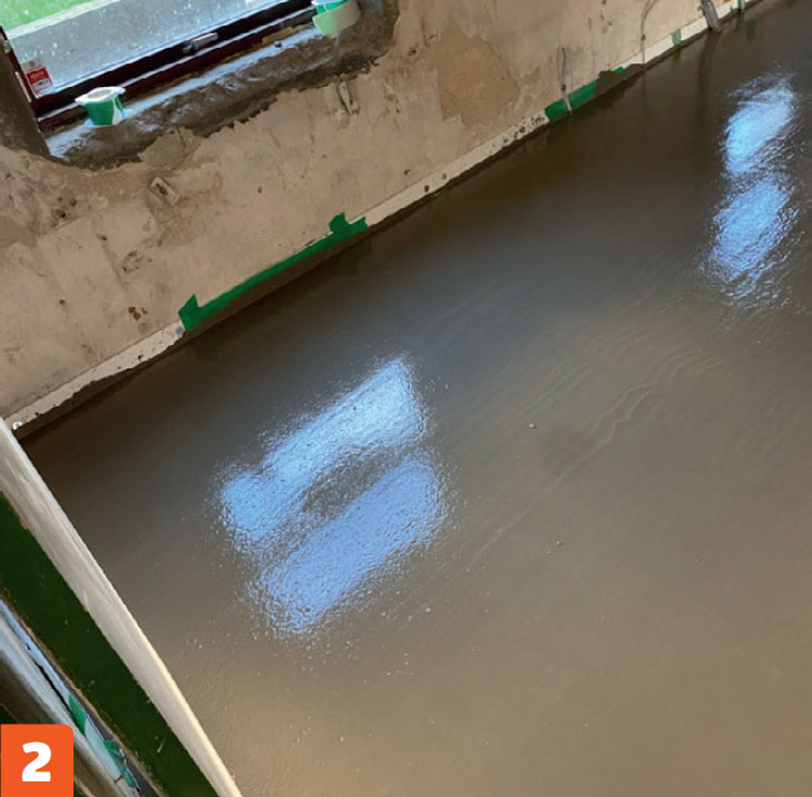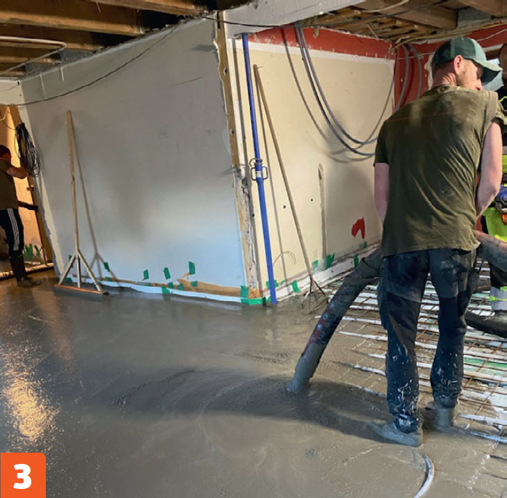 Betoni on saapunut. Betonin voi pumpata lattialle esimerkiksi ikkunasta. Massa on notkeaa, mutta se ei leviä itsestään eri huoneisiin.