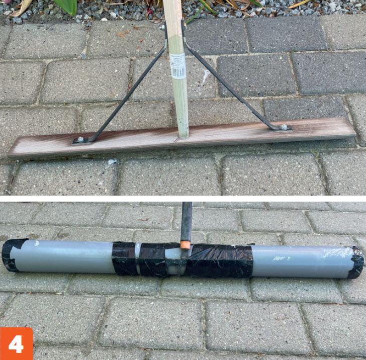 Oikeat välineet helpottavat. Yllä näkyy asfalttihara, jolla betonia levitetään lattialla. Alla näkyvää, muoviputkesta tehtyä työkalua käytetään betonin tiivistämiseen. Voit käyttää sen sijaan tärysauvaa.