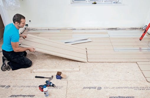 Nykyaikaiset ponttilattiat on todella helppo asentaa, jos työn aloittaa oikein. Käytä mittaamiseen ja laskemiseen aikaa, kunnes sinulla on käsitys, mistä kannattaa aloittaa. Älä aloita täysilevyi-sellä laudalla niin, että työ päätyy kape-aan kaistaleeseen vastakkaisella sei-nällä. On parempi sahata molemmista laudoista hieman pois. Huomioimme myös kahden huoneen yhdistämisen.