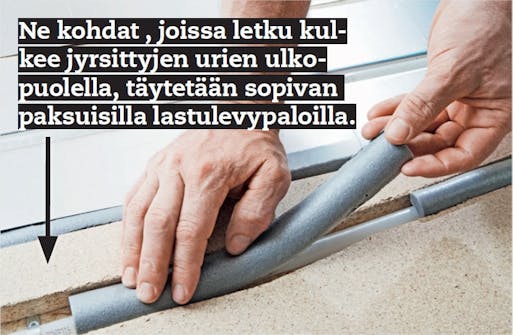 Letkuja varten uritetut lastulevyt voi-daan nyt asentaa. Esimerkissä on sekä pitkiä levyjä yhdensuuntaisine urineen että lyhyitä kääntölevyjä, jotka ohjaavat letkut takaisin vastakkaiseen suuntaan. Usein joutuu jyrsimään tai sahaamaan joitakin lisäuria, ja letkun saattaa joutua ohjaamaan myös levyjen välistä.