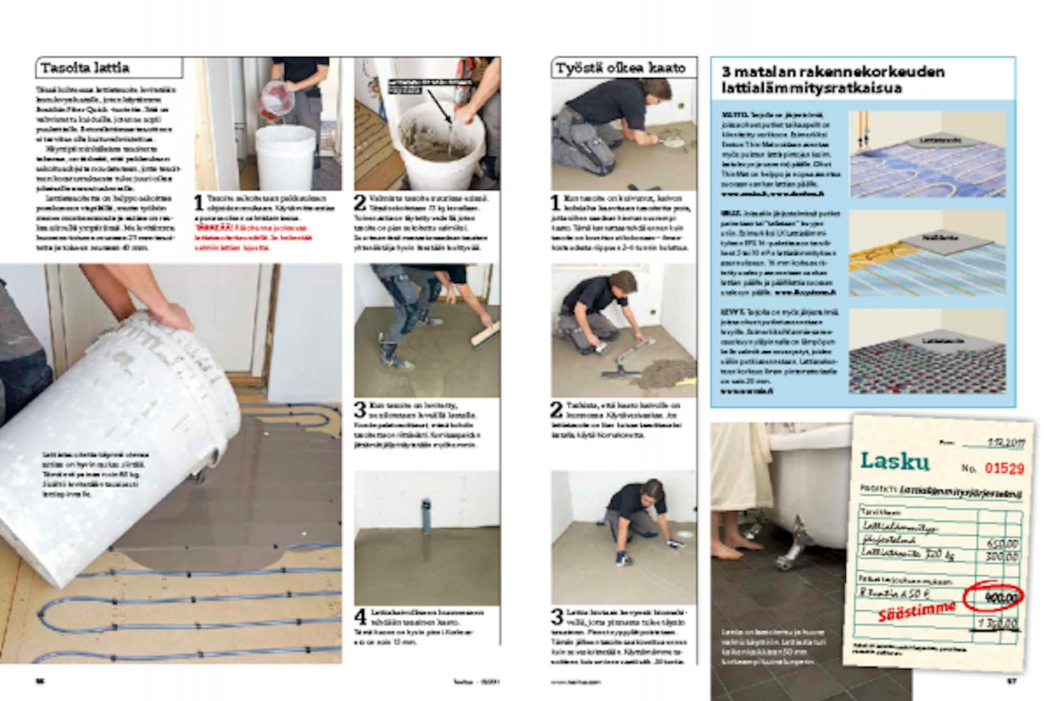 Palkkasimme lvi-asentajan testaa-maan järjestelmän ja tasoittamaan lat-tian. Työ maksoi meille noin 400 €. Jos haluaa itse tasoittaa lattian, järjestelmää pitää kokeilla ensin. Järjestelmä täyte-tään vedellä ja pumppu pannaan päälle noin 15 minuutiksi.