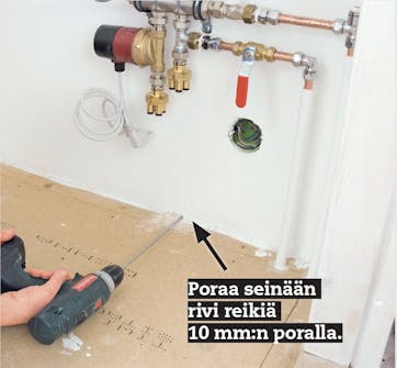Poraa lämpökaapeleille reiät sei-nän läpi. Lämmönjakotukki (shuntti) ei saa sijaita huoneessa, jonka ilmankos-teus on korkea. Tässä asennamme lattia-lämmityksen kylpyhuoneeseen, joten jakotukki sijoitetaan viereiseen tilaan.