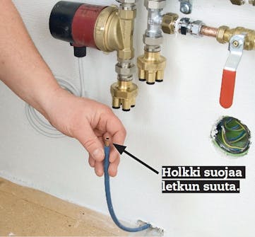 Yksi letkuista liitetään lämmön-jakajaan. Lämmitysletkuun kiinnite-tään pieni holkki (metalliputken pala) ennen kuin letku kiinnitetään jakajaan. Holkki estää letkun puristumisen kiristettäessä.