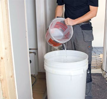 Valmista tasoite suurissa erissä. Tässä sekoitetaan 75 kg kerrallaan. Toinen astia on täytetty vedellä, joten tasoite on pian sekoitettu valmiiksi. Suurissa erissä massasta saadaan tasaisen yhtenäistä ja hyvin itsestään levittyvää.