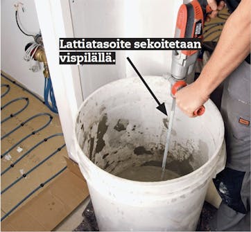 Lattiatasoitetta on helppo sekoittaa porakoneen vispilällä, mutta työhön menee monta annosta ja astiaa on raskas siirrellä ympäriinsä. Me levitämme huoneen toiseen reunaan 25 mm tasoi-tetta ja toiseen reunaan 40 mm.