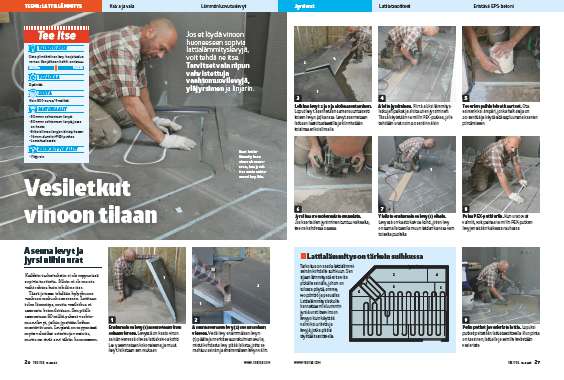 Sen päälle asennetaan 50 milliä paksut vaahtomuovilevyt, joihin jyrsitään letkun mentävät urat. Levyistä on myynnissä myös valmiiksi uritettuja versioita, mutta ne eivät sovi tähän huoneeseen.