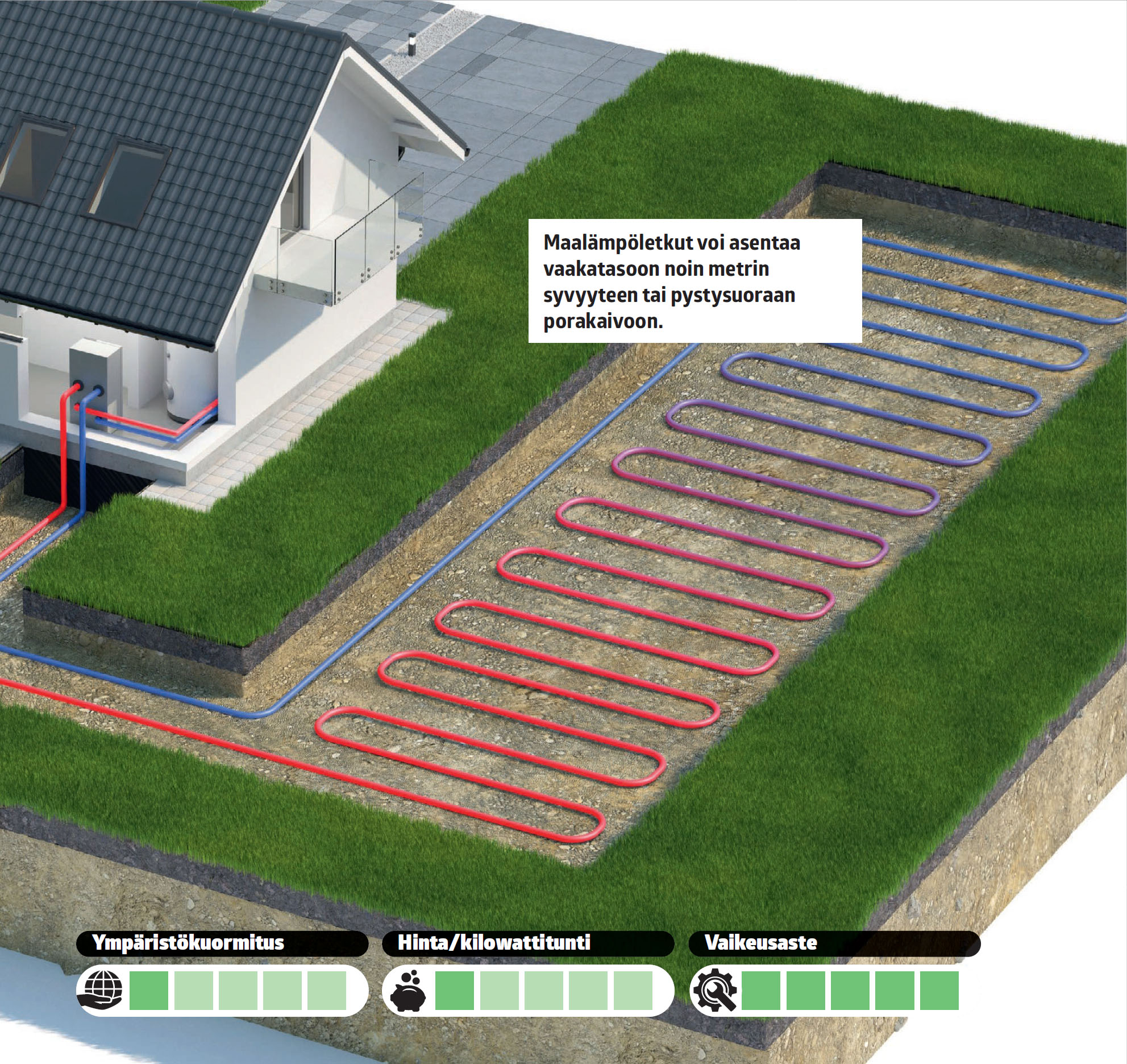 - MAALÄMPÖ: Ympäristöystävällinen vaihtoehto, joka on kallis asentaa.