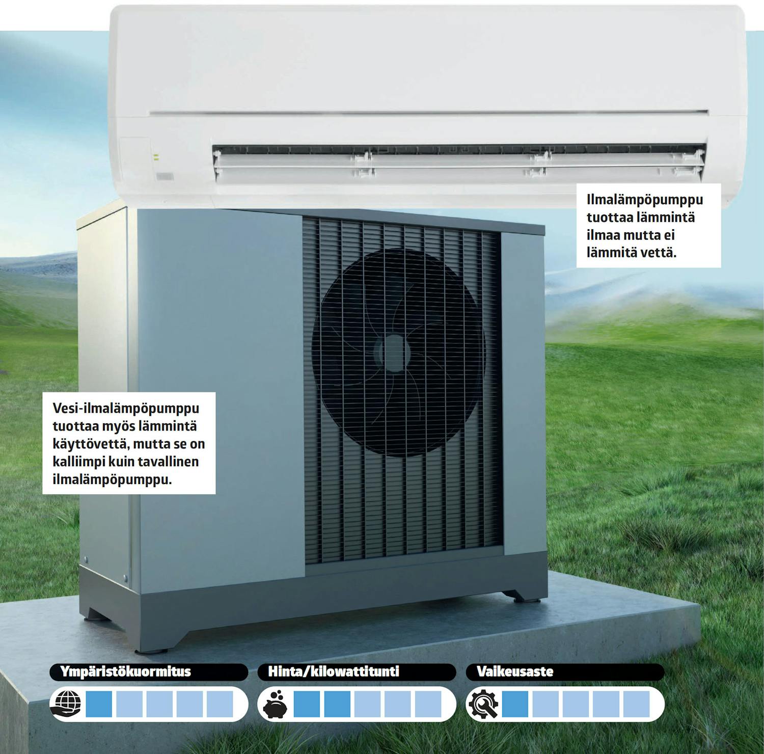 - ILMALÄMPÖPUMPPU: Säästää ympäristöä eikä tule kovin kalliiksi, mutta ei lämmitä käyttövettä.