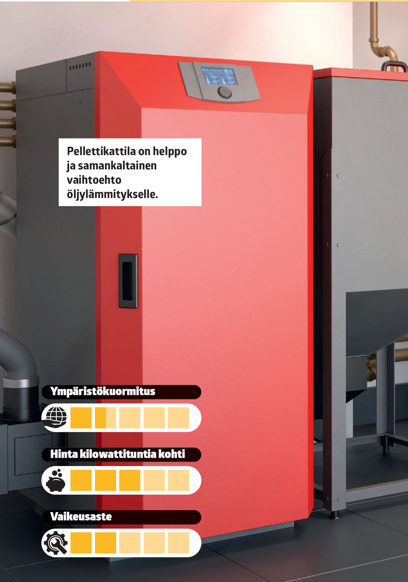 Pellettikattila voi olla joissakin tapauksissa helppo ratkaisu, sillä sen voi vaihtaa vanhan öljykattilan tilalle. Pellettilämmitys toimii periaatteessa samalla tavalla kuin öljylämmitys mutta eri polttoaineella eli puulla. Pellettivarasto täytetään säännöllisesti kuten öljysäiliö, ja pelletit siirtyvät säiliöstä tulipesään itsestään tarpeen mukaan.