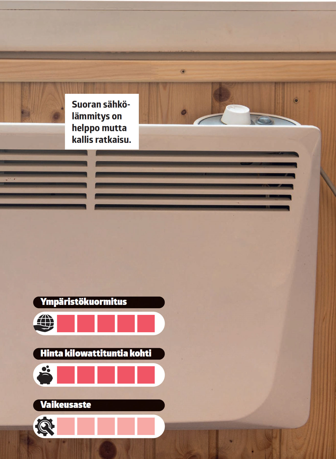 - SÄHKÖ: Suora sähkölämmitys on varma ja helppo mutta todella kallis vaihtoehto.