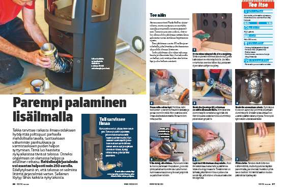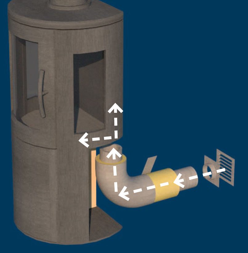 Asennamme tässä Varde AirBox -järjestelmän, mutta saatavana on muitakin samalla periaatteella toimivia järjestelmiä. Toiminta perustuu siihen, että talon ulkopuolelta johdetaan raitista ilmaa palamista varten sisäilman käyttämisen sijasta.
