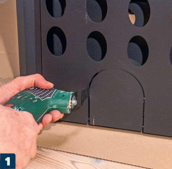 Irrota takan takapuolella oleva suojalevy. Siinä on pienet kielekkeet (tässä 5 kpl), jotka katkaistaan monitoimityökalulla. Jos letku on tarkoitus asentaa lattian läpi, poista sen sijaan takan pohjan suojalevy.