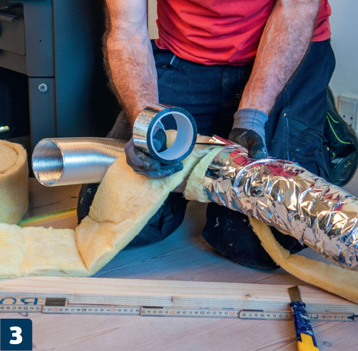 Ilmaletku (joustoputki) eristetään 20 millin mineraalivillalla. Kiinnitä eriste alumiiniteipillä samalla kun pyörität sitä. Kierrä lopuksi useita kerroksia alumiiniteippiä eristeen ympärille.