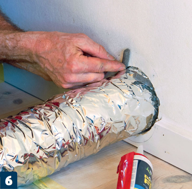 Viimeistely ulkotiloissa. Mukana toimitettu kaulus painetaan ilmaputkeen, jossa sitä pitää paikallaan kumitiiviste. Laita hieman kumimassaa kauluksen yläosaan ja työnnä se paikoilleen reikään.