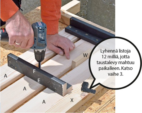 Kasaa pohjalaudat (A) kulmalistoilla (F/E). Aseta laudat sapluunalle (X) ja käytä välikapulana rimaa (W). Ruuvaa ja liimaa kulma-listat kiinni hyllyn sisäpuolelta. Jätä päätyihin laudan mentävä rako.