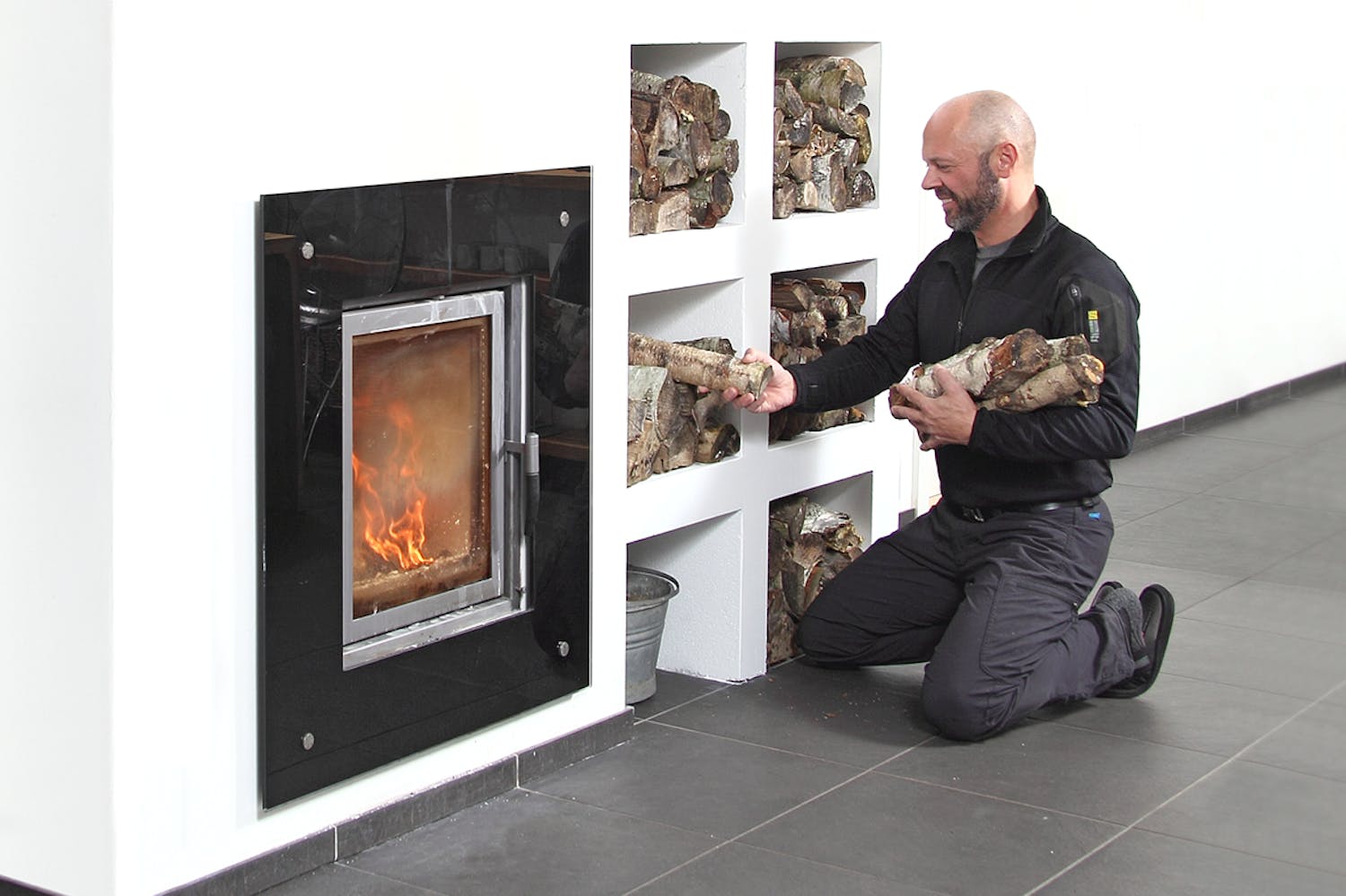 Me rakennamme hyllykön 10 cm pak-suista kevytbetonilevyistä hieman sei-nästä ulos työntyvän tulisijan viereen. Hyllykön korkeus on sama kuin tulisijan, ja siinä on kuusi lokeroa, kolme molem-min puolin. Hyllykköön tulee sivu, yläreuna ja keskelle ”väliseinä”.