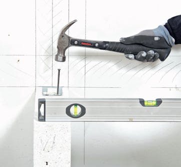 Naulaa levy kiinni kulmahelaan, kun olet tarkistanut, että sen asento on hyvä. Käytä 4 tuuman nauloja, ja iske ne hieman viistoon niin, että naula vetää levyä hieman kohti seinää. Yksi naula per hela riittää hyvin.