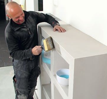 Ensin hyllykkö hiotaan, puhdistetaan ja tasoitetaan hiekkatasoitteella. Kun pinta on kuiva, se välihiotaan. Tämän jälkeen hyllykkö puhdistetaan jälleen ja hiekkatasoitetaan toistamiseen. Lopullisen hionnan jälkeen hyllykkö puhdiste-taan, ja sitten se voidaan jälkikäsitellä. Me päätimme verhoilla sen seinien tapaan lasikuitukankaalla. Voit myös maalata tasoitetut pinnat, jos levität maalin alle tartuntapohjusteen.