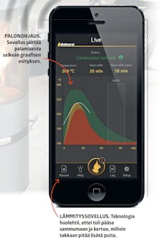 Ohjausyksikössä on kaksi lämpömit-taria, jotka ovat langattomassa yhtey-dessä sovellukseen. Mittarit tarkkailevat palamista, ja sovellus neuvoo käyttäjää tuhansista testipoltoista kertyneiden tieto-jen perusteella. Käyttöönoton yhteydessä sovellukseen ohjelmoidaan joitakin arvoja, jotka löytyvät takan ohjekirjasta tai kyljessä olevasta merkkikilvestä.