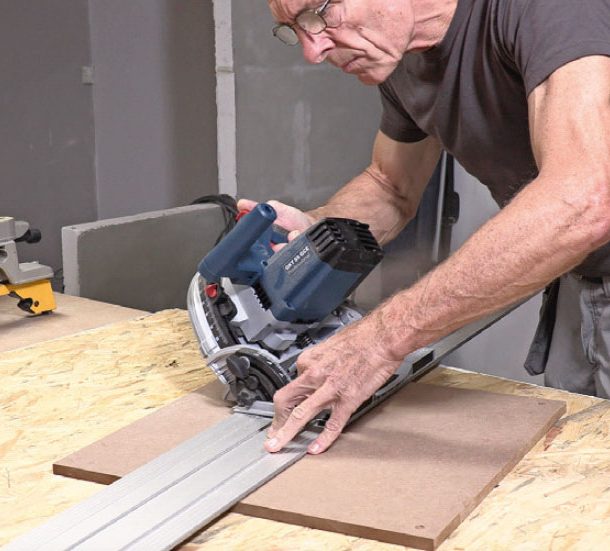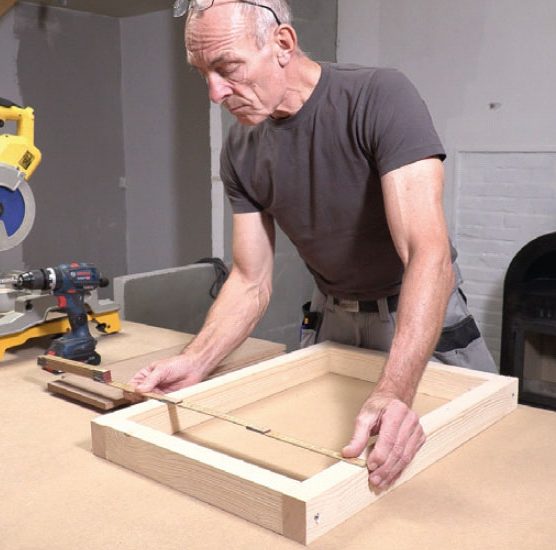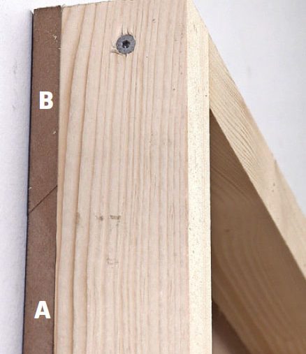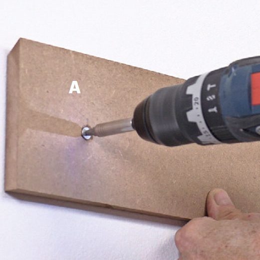 Sahaa 18 milliä paksusta MDF-levystä pala, joka sopii esineen taakse, ja halkaise se kahtia 45 asteen kulmassa. Saat kaksi yhteen sopivaa rimaa.