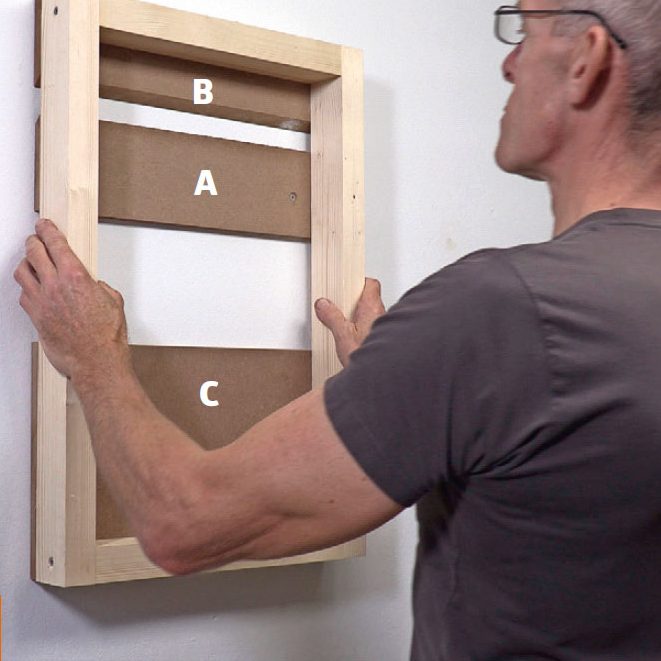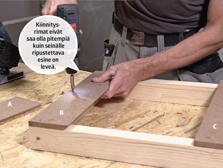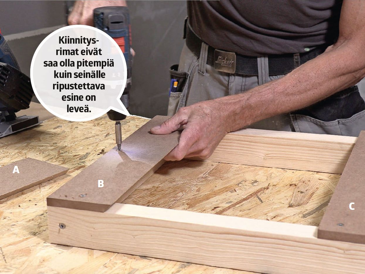 Ruuvaa toinen kiinnitysrima (B) kiinni esineen taakse. Pidä huoli, että asennat sen oikein päin, jotta se sopii seinään ruuvattavan riman (A) päälle. Ruuvaa yhtä paksu rima (C) esineen alaosaan, jotta se tulee samalle etäi syydelle seinästä.