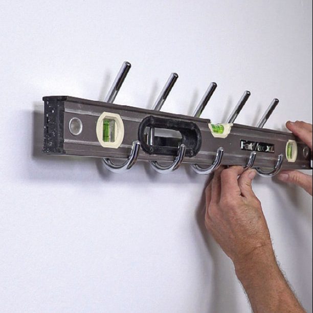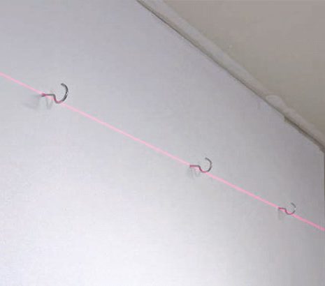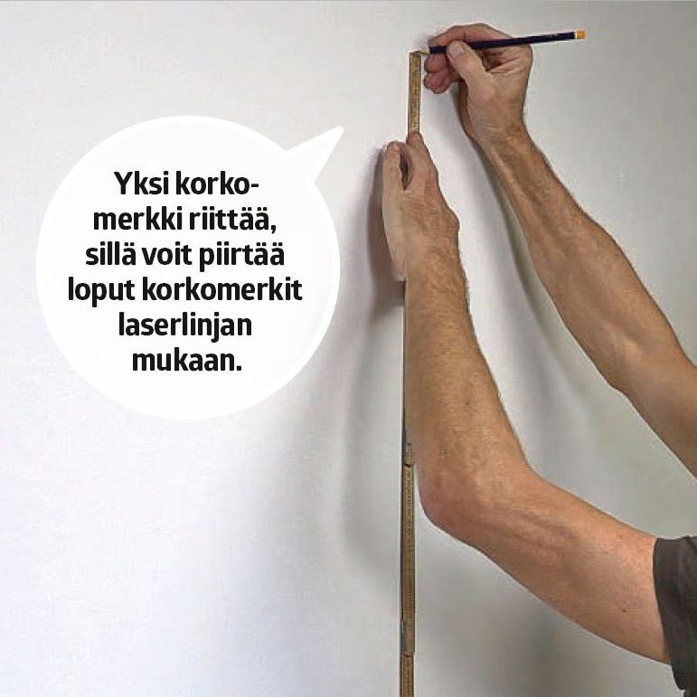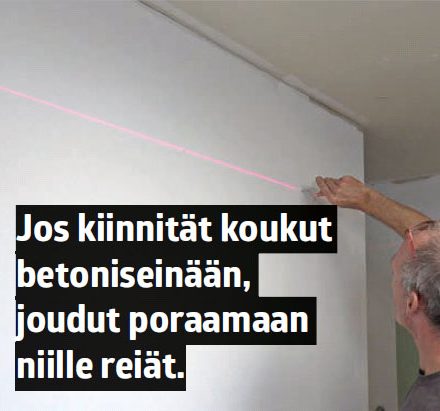 Vaatekoukut pitää ripustaa tarkasti samaan linjaan, sillä jo muutaman milli metrin heitto pistää silmään. Jos käytät apuna linjalaseria, voit ruuvata koukut suoraan linjan kohdalle, joka on varmasti vaakasuorassa.
