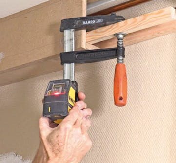 Etsi laserille sopiva paikka. Jotkut laserit voi kiinnittää puristimen varteen. Voit käyttää alustana myös kirjapinoa, tuolia, tikapuita tai mitä tahansa vaaka-suoraa ja tarpeeksi leveää pintaa.