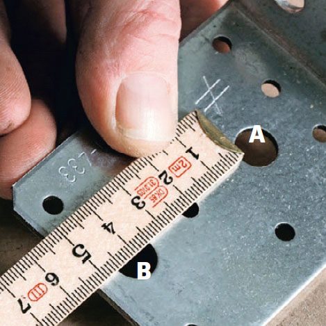Se on paljon helpompaa ja tarkempaa, kun mittaat samasta reunasta samaan reunaan. Kuvassa näkyvien A- ja B-pisteiden etäisyys on sama kuin reikien keskikohtien.