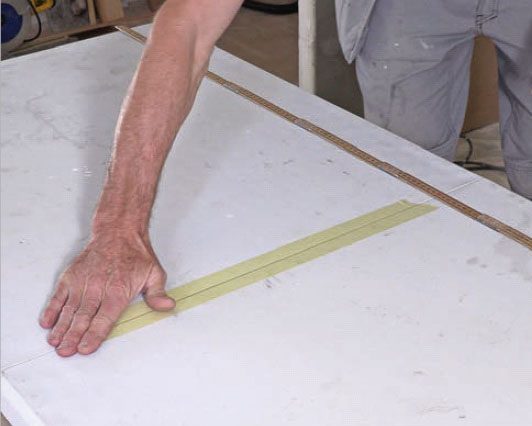 Mittaa ruokapöydän keskikohta pituussuunnassa ja liimaa pöydän poikki pätkä maalarinteippiä. Mittaa toiseen kertaan ja tee teippiin merkki tarkasti pöydän keskikohtaan.