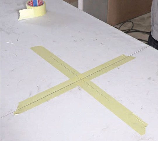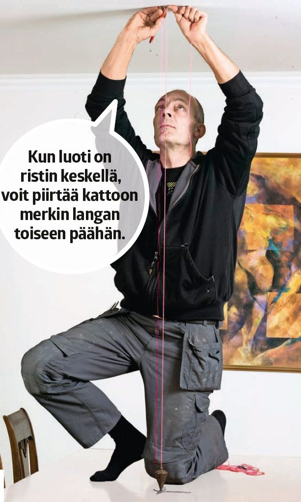 Tee samat asiat uudestaan, mutta tällä kertaa pöydän poikkisuunnassa. Piirrä toinen merkki ristiin edellisen päälle. Nyt tiedät, missä pöydän keskikohta on ja missä kohdassa lampun keskikohdan pitää roikkua.