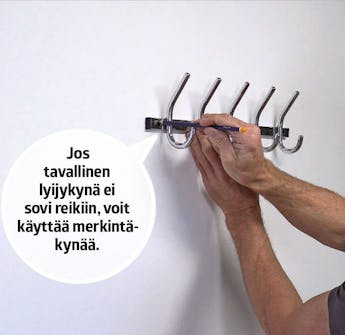 Merkitse koukkujen paikat terävällä lyijykynällä. Mittaa tarkasti, jotta kaikki koukut tulevat yhtä kauas toisistaan.