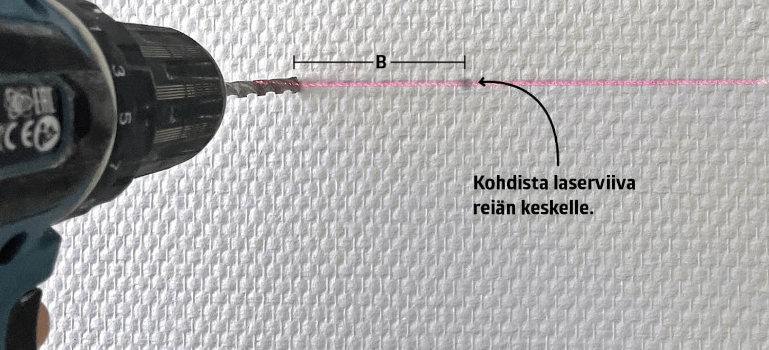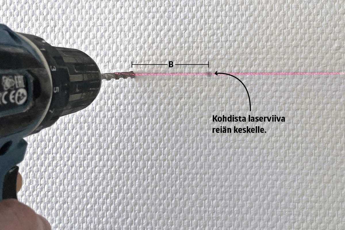 Kohdista sen jälkeen laserviiva reiän keskelle ja tee toinen reikä samaan linjaan. Halvimmat linjalaserit maksavat noin 50 euroa. Laitteen avulla on helppo asentaa hyllyjä ja tauluja samalle korkeudelle huoneen eri seinille.
