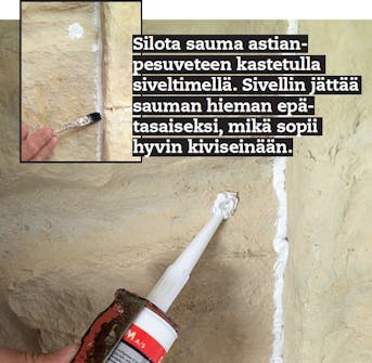 Maalaa sauma, kun se on kuiva 1-2 päivän kuluttua. Käytä akryyli-maalia ja levitä se siveltimellä, joka on samanlevyinen kuin sauma. VINKKI: Kun maaliin sekoittaa hienoa ran-tahiekkaa, pintarakenteesta tulee rosoinen.
