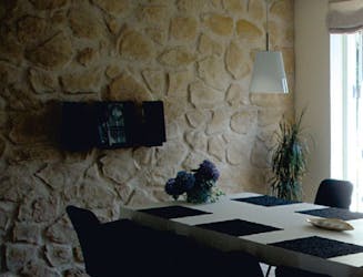 Tämän lastenhuoneen takaseinän muuttaminen lasikuitulevyillä oikean kiviseinän näköiseksi vei aikaa neljä tuntia. Levyjä on helppo leikata kulmahiomakoneella tai pistosa-halla, ja ne voi ruuvata suoraan seinään. Liitokset saumataan akryylisaumaus-massalla, jonka päälle voi sivellä levyjen väristä maalia, jolloin liitokset eivät näy.