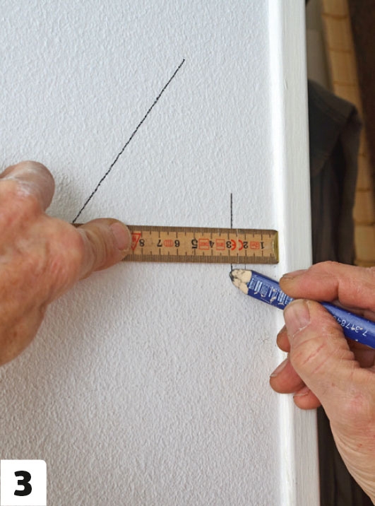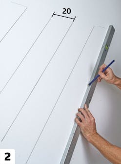 Mittaa ja merkitse seinään paneelien leveys ja korkeus. Piirrä ylälinja vaakatasoon pitkän vatupassin avulla.