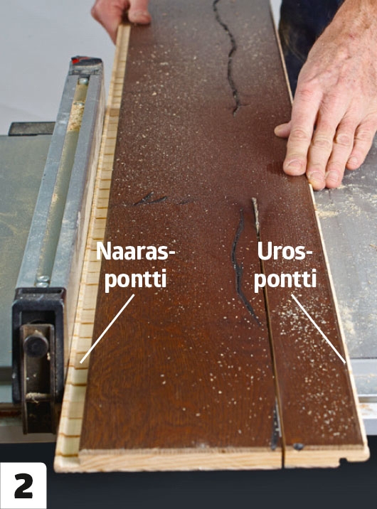 Halkaise reunalaudat sopivan levyisiksi. Varmista, että halkaiset laudat oikein päin: toiseen pitää jäädä urospontti, toiseen naaraspontti.