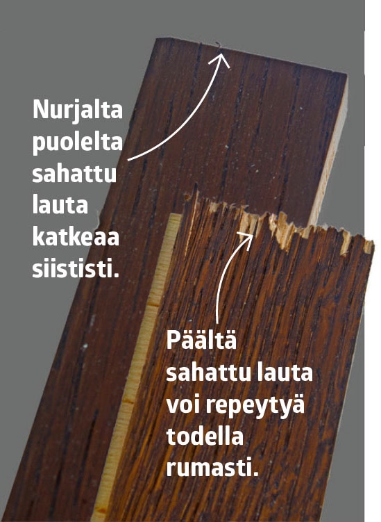 Katkaise aluksi kaikki laudat oikean mittaisiksi sirkkelillä. Sahaa nurjalta puolelta, jotta terä ei revi lautojen pintaan rumia jälkiä.
