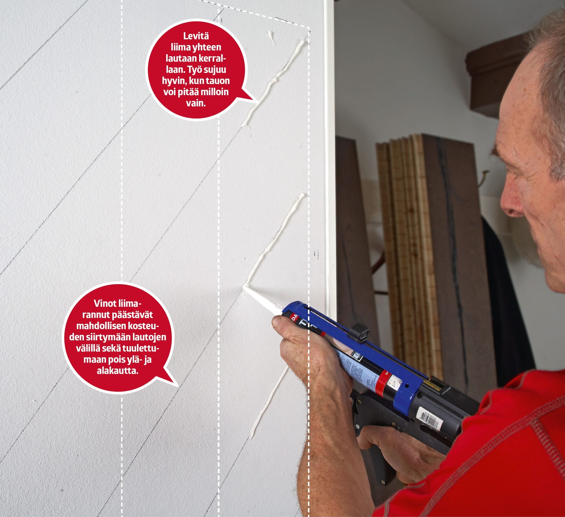 Piirrä seinään vinot liimauslinjat noin 20 sentin välein. Ilma kiertää paneelien alla, kun liima levitetään vinoon.