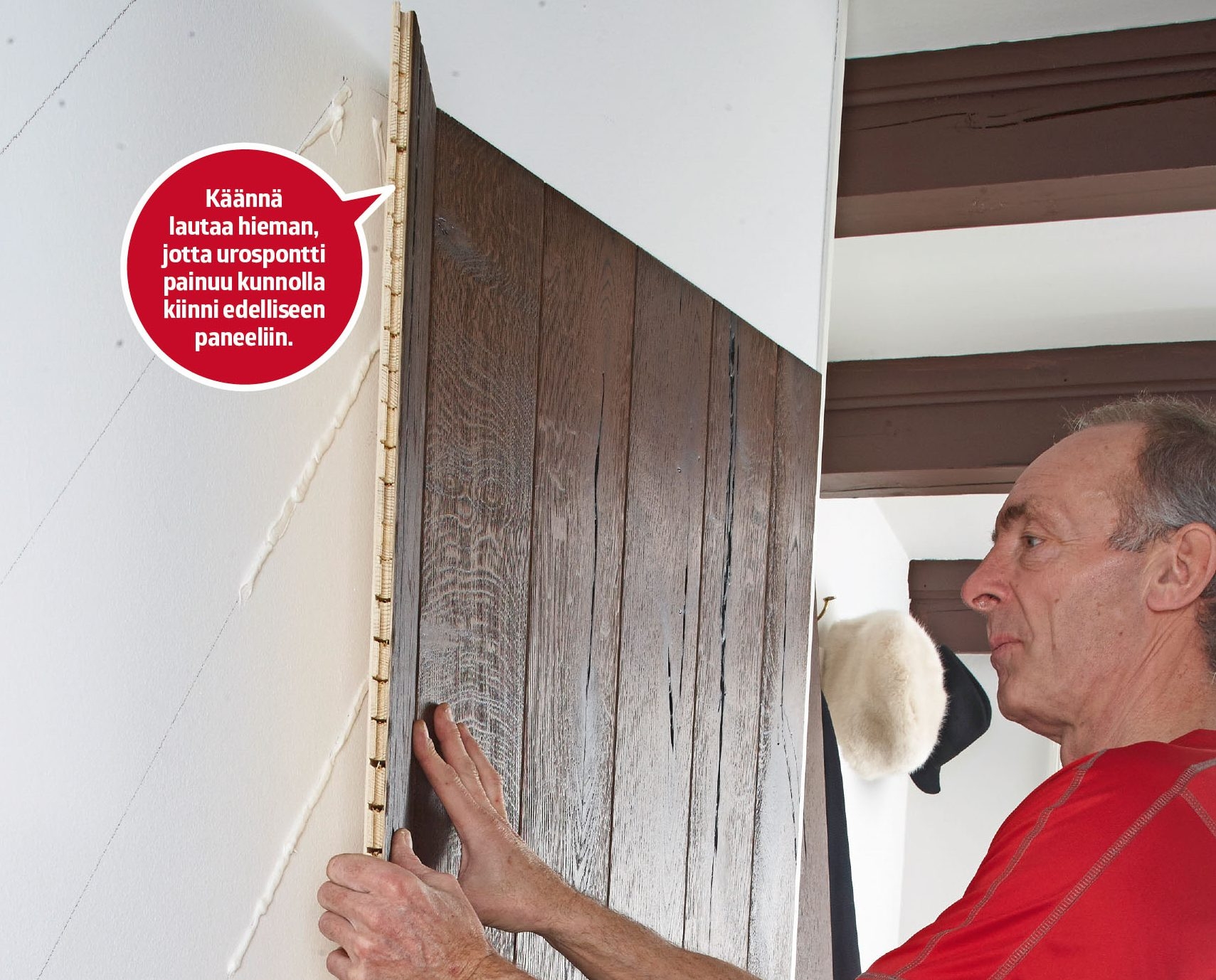 Paina ensimmäinen lauta kiinni liimaan naaraspontti eteenpäin. Käännä halkaistu reuna suoraan viivan mukaan.