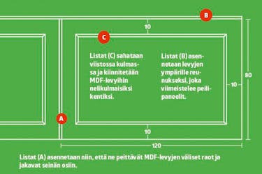 Sahaa listat (C) nelikulmaisia kenttiä varten. Sahaa listat oikean pituisiksi 45 asteen kulmassa, jotta niiden saumoista tulee siistit.