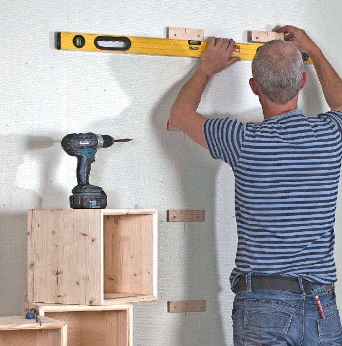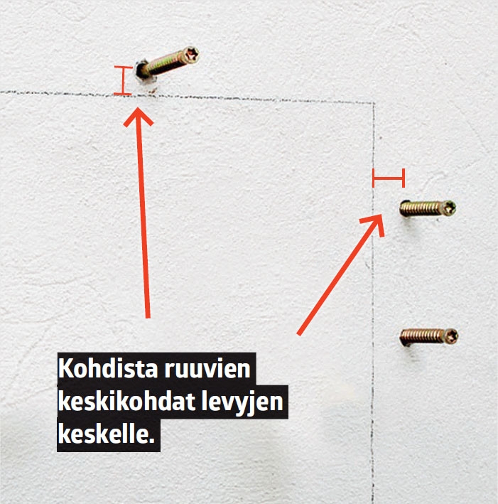 Tässä kiinnitetään seinään 40 milliä paksuista levyistä tehty hylly. Ruuvien paikat merkitään 20 millin päähän viivasta. Sen jälkeen seinään porataan reiät, joihin asennetaan karmiruuvit.