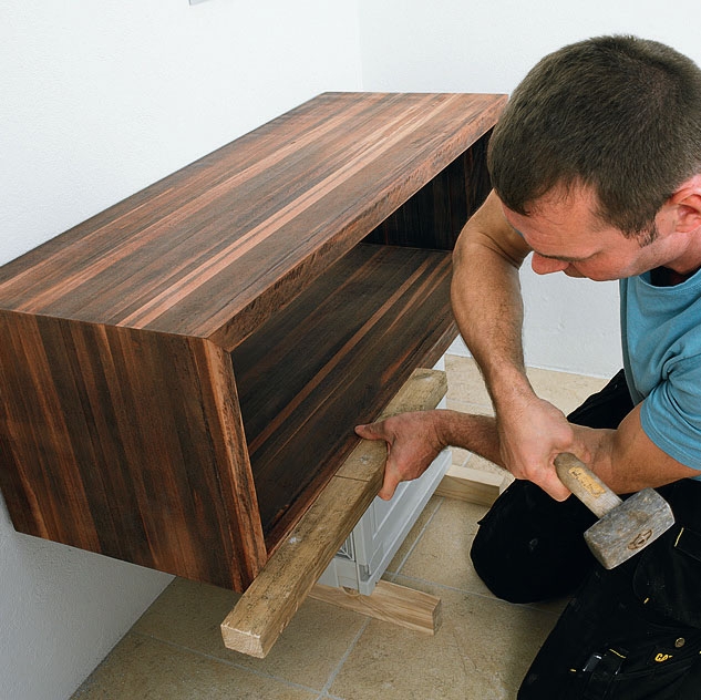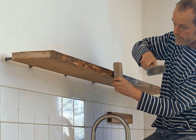 Kun kaikki ruuvit ovat paikoillaan, voit koputtaa hyllyn kiinni seinään. Väliin ei tarvita liimaa, sillä hylly pysyy paikallaan ilmankin. Pidä hyllyn ja vasaran välissä puukapulaa, jotta hyllyyn ei tule koloja.
