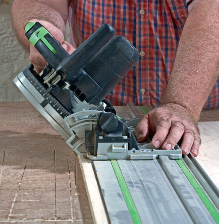 Yläkaappien ja pienten kirjahyllyjen kannakerimat sahataan vanerista. Tässä halkaistaan leveä rima kahteen osaan 45 asteen kulmassa.