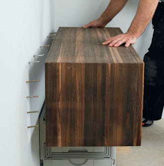 Irtohyllyn voi kiinnittää seinään teräs-putkilla tai kierretangoilla ilman näkyviä kiinnikkeitä. Poraa seinään reiät, liimaa tangot reikiin ja poraa hyllyn taakse reiät tarkasti tankojen kohdalle. Tee rei'istä syvät, jotta hylly kestää painoa.
