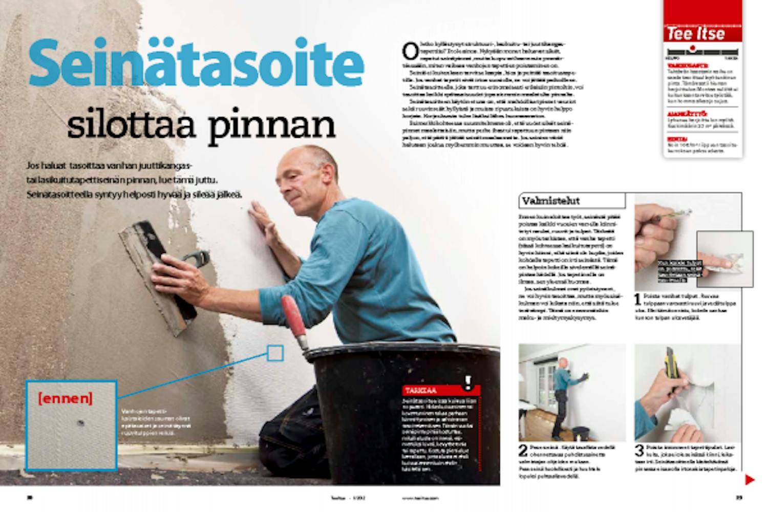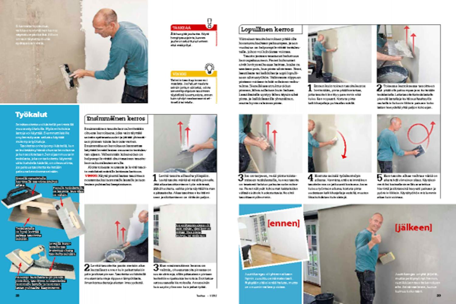 Tasoite pitää levittää kahtena kerroksena epätasaisiin seinäpintoihin. Tasaisemmissa pinnoissa tälle ei ole tarvetta.