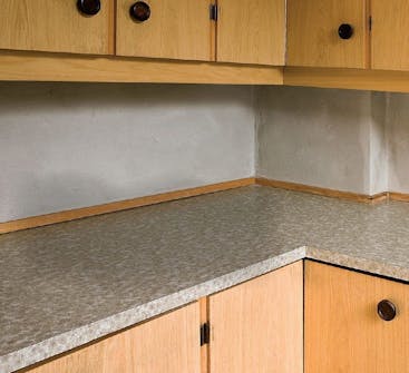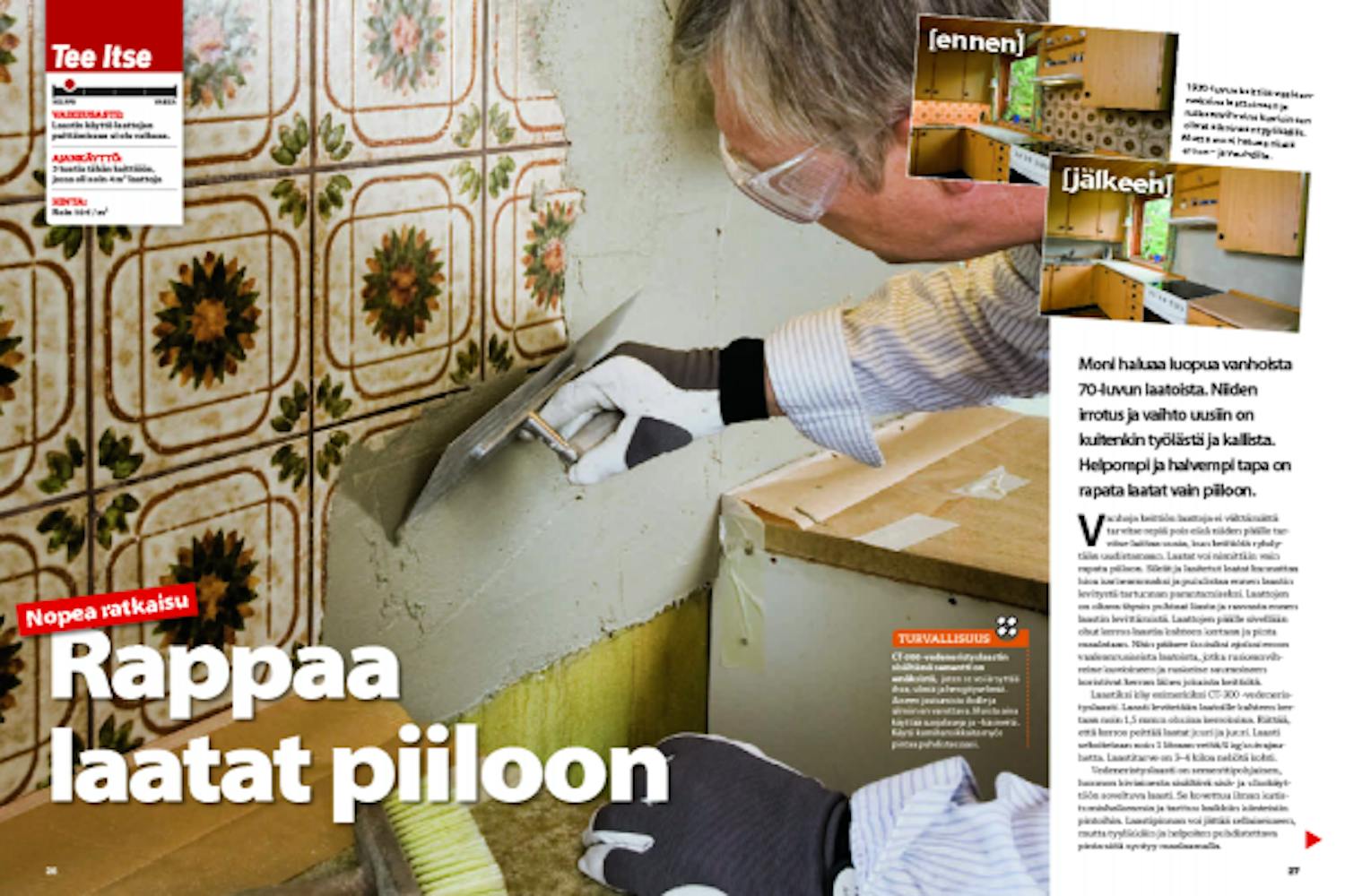 Peitä keittiötason lista sekä laatta-verhoilun reunoilla olevien kaappien sivut perusteellisesti maalarinteipillä ennen työhön ryhtymistä.