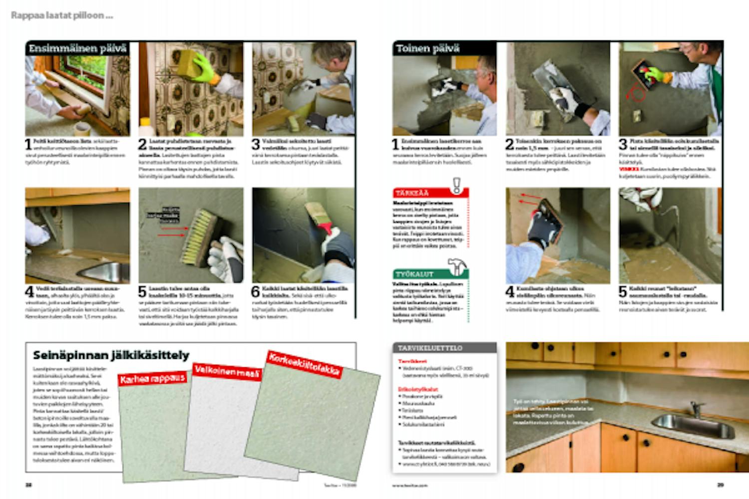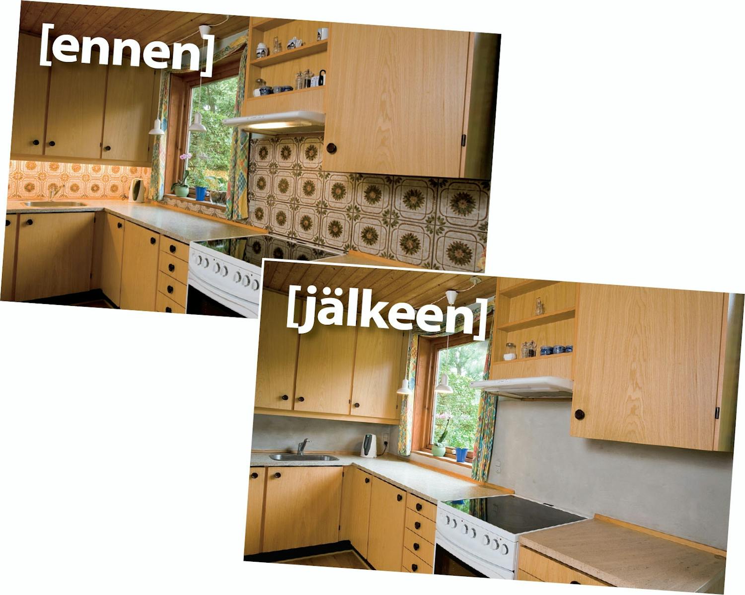 Laastipinnan voi jättää käsittele-mättömäksi ja karheaksi. Se ei kuitenkaan ole rasvaahylkivä, joten se sopii huonosti hellan tai muiden kovan rasituksen alle jou-tuvien paikkojen läheisyyteen. Pinta kannattaa käsitellä laasti/ betonipinnoille soveltuvalla maalilla, jonka kiilto on vähintään 20 tai korkeakiiltoisella lakalla, jolloin pinnasta tulee pestävä. Lähtökohtana on sama rapattu pinta kaikissa kol-messa vaihtoehdossa, mutta loppu-tuloksesta tulee aivan eri näköinen.