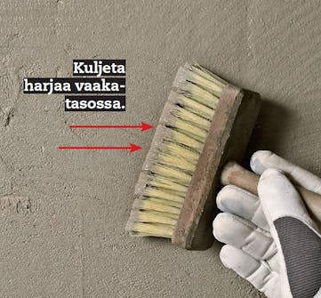 Laastin tulee antaa olla kaakeleilla 10-15 minuuttia, jotta se pääsee tarttumaan pintaan niin tuke-vasti, että sitä voidaan työstää kalkkiharjalla tai siveltimellä. Harjaa kuljetetaan pinnassa vaakatasossa ja siitä saa jäädä jälki pintaan.