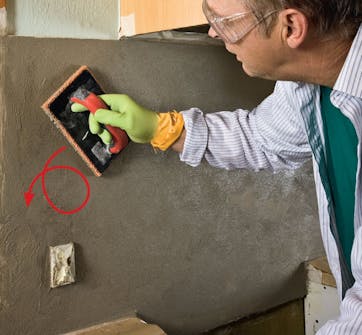Vedä teräslastalla useaan suun-taan, alhaalta ylös, ylhäältä alas ja vinottain, jotta saat laattojen päälle yhte-näisen ja täysin peittävän kerroksen laastia. Kerroksen tulee olla noin 1,5 mm paksu.